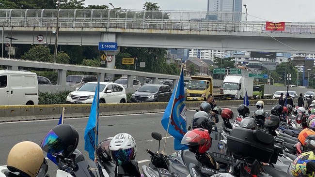 Kemacetan pun terjadi karena lajur lainnya tak bisa dilintasi. Massa juga terlihat memarkirkan kendaraan di pinggir Jalan Gatot Subroto.
