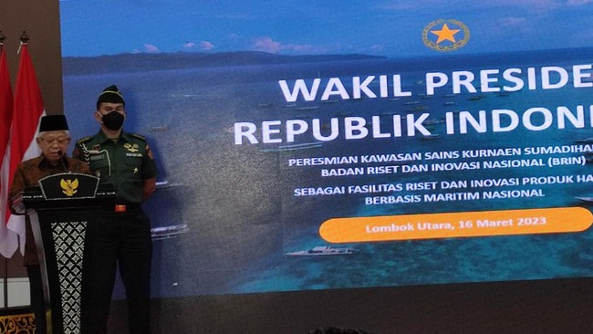 Wakil Presiden (Wapres) Ma'ruf Amin meresmikan Kawasan Sains Kurnaen Sumadiharga Badan Riset dan Inovasi Nasional (BRIN) sebagai fasilitas riset dan inovasi produk halal berbasis maritim nasional di Lombok, Nusa Tenggara Barat. Ma'ruf Amin berharap BRIN dapat mengoptimalkan potensi sumber daya maritim dan kelautan Indonesia dalam pembangunan inovasi produk halal.