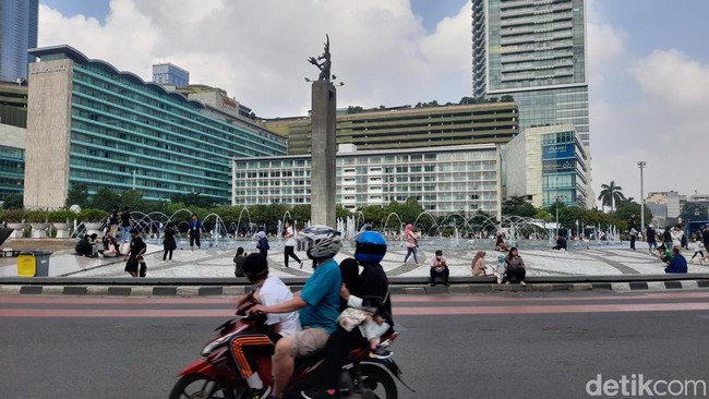 Sejumlah warga juga swafoto di sekitar air mancur Bundaran HI. Mereka asyik duduk meski ada kendaraan yang lalu lalang.