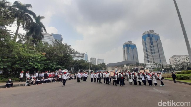 Pantauan detikcom di lokasi pada Senin (20/3/2023), pukul 10.00 WIB, sejumlah peserta unjuk rasa mulai mendatangi Patung Kuda. Mereka terlihat mengenakan kemeja putih, celana hitam, dan ikat kepala merah.