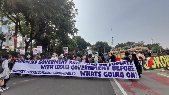 "Kami menolak kedatangan timnas Israel U-20 karena mereka adalah Zionis yang sampai saat ini masih menjajah Palestina," kata salah seorang orator di atas mobil komando.