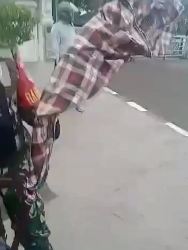 Remaja membawa sajam tersebut ditangkap anggota Babinsa. Babinsa berseragam loreng itu terlihat memegang celurit panjang yang ditutup kain sarung.