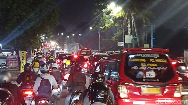 Pantauan detikcom, Selasa (21/3/2023) pukul 20.30 WIB, kemacetan terjadi sejak kantor Antam, Jakarta Timur. Kendaraan roda dua maupun roda empat hanya bisa melaju perlahan.