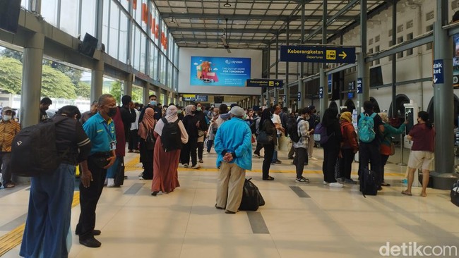 Pantauan detikcom di Stasiun Pasar Senen, Jakarta Pusat, pada Rabu (22/3/2023) pukul 10.05 WIB, calon penumpang terus berdatangan. Beberapa penumpang lain juga terlihat tengah berdiri menunggu pemeriksaan dokumen di sekitar pintu masuk.