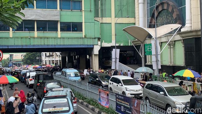 Kondisi kemacetan menyebabkan laju kendaraan berjalan lambat. Petugas parkir Pasar Tanah Abang tampak membantu warga yang hendak keluar-masuk parkiran.