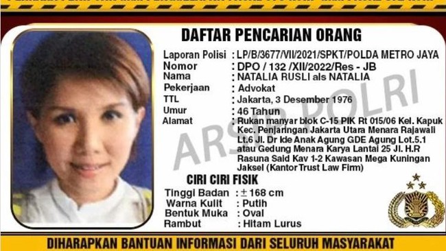 Pengacara Natalia Rusli, yang sempat masuk dalam daftar pencarian orang (DPO) Polres Metro Jakarta Barat, akhirnya menyerahkan diri ke polisi. Natalia Rusli langsung ditahan polisi.