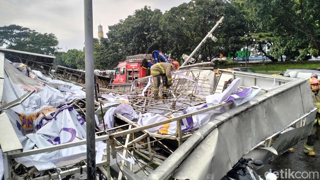 Papan reklame berukuran raksasa roboh menimpa sepeda motor dan mobil di Jl Soekarno Hatta, Kota Bandung, Jawa Barat. Akibatnya, satu orang mengalami luka berat.