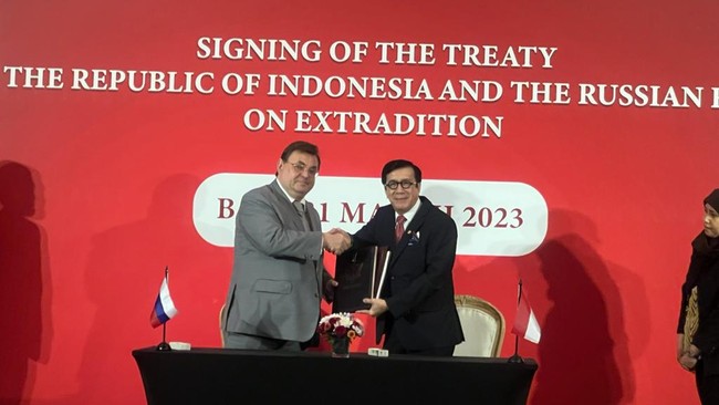 Menteri Hukum dan Hak Asasi Manusia (Menkumham) Yasonna H Laoly bersama Menteri Hukum Federasi Rusia Konstantin Chuichenko menandatangani perjanjian ekstradisi antara Republik Indonesia (RI) dan Federasi Rusia. Perjanjian ini penting agar kedua negara bisa saling membantu dalam mencegah kejahatan.