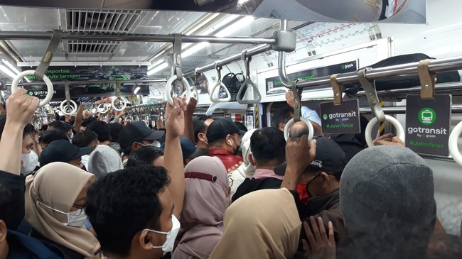 "Tadi saya udah maksa masuk bareng teman saya itu di depan, tapi penuhnya ampun banget, akhirnya saya ngalah, turun lagi," ujar Dwi.