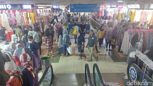 Pantauan detikcom di Blok A, Pasar Tanah Abang, Jakarta Pusat pada Sabtu (1/4/2023) pukul 09.42 WIB, terlihat pusat perdagangan tekstil terbesar di Asia Tenggara itu sudah dipadati pengunjung. Warga berbondong-bondong menyambangi kios demi kios untuk berbelanja.
