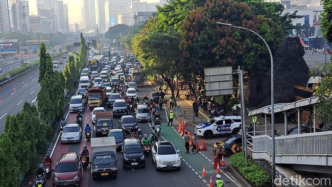 Sementara itu, situasi arus lalu lintas di Jalan Gatot Subroto mengalami kemacetan. Kemacetan mengular dari pintu masuk Polda Metro hingga gedung Sawarna BRIN.
