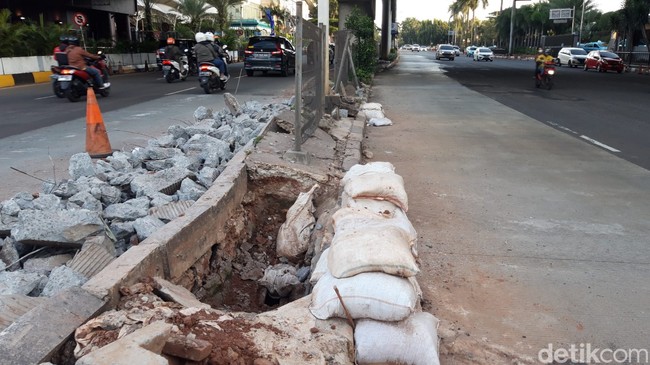 Genangan sumber kerusakan Jl Metro Pondok Indah masih belum selesai ditangani. Saluran sumber genangan masih dibongkar dan dipagari dengan karung-karung tanah.