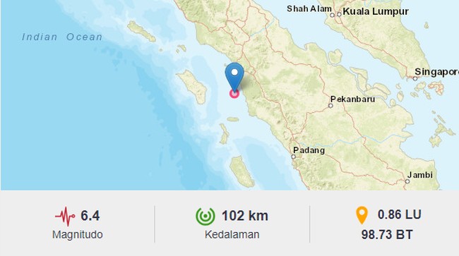 Gempa magnitudo 6,4 mengguncang wilayah Padang Sidempuan, Sumatera Utara. BMKG menyampaikan kedalaman gempa berada di 102 kilometer.