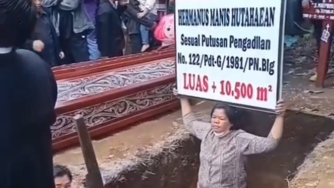 Video seorang wanita di Toba masuk ke lubang kubur sambil membawa spanduk penolakan viral di media sosial. Wanita itu disebut menolak jenazah keluarganya dikuburkan di tanah tersebut.