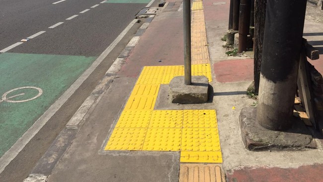 Selain itu, guiding block di depan Universitas Pratiwi juga terlihat sudah diperbarui. Jalur kuning yang sebelumnya terhalang oleh papan pemberitahuan bus kini dibelokkan agar tak lagi menabrak tiang. Ubin pemandu itu pun terlihat sudah diganti dan ditempatkan di sekitar papan pemberitahuan.