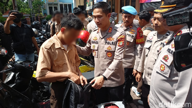 Pantuan detikcom di lokasi, Rabu (5/4/2023), sejumlah polisi mengecek kendaraan para pelajar tersebut. Beberapa pelajar SMA yang membawa motor tapi tidak bawa helm diwawancarai secara singkat oleh polisi.