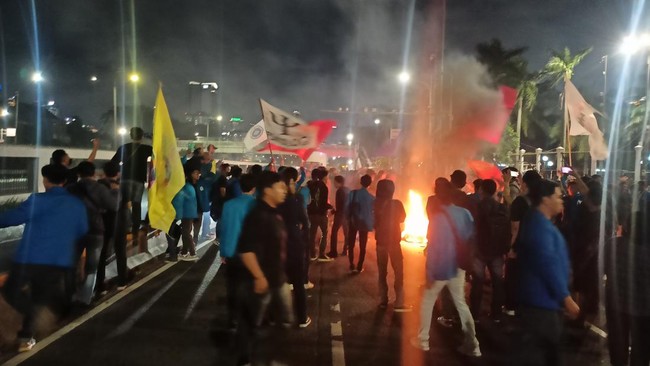 Pantauan detikcom di Jalan Gatot Subroto, Rabu (5/4/2023), pukul 18.37 WIB, massa mulai membakar ban. Terlihat pula seorang demonstran yang membakar flare.