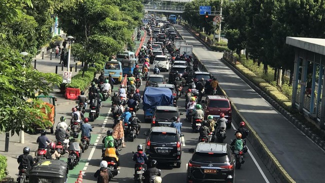 Sejumlah kendaraan ada yang mengambil jalur TransJakarta. Sebagian pengendara lain juga mengambil jalur khusus sepeda yang dibatasi stick cone di sisi kiri jalan.