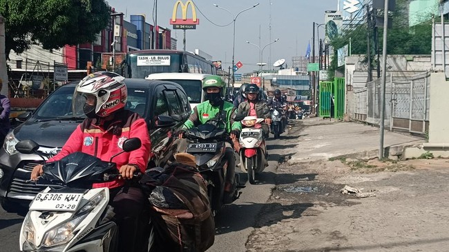 Laju kendaraan hanya kurang dari 10 km per jam. Motor yang saling serobot turut menambah kemacetan. Kendaraan sendiri di dominasi oleh motor.