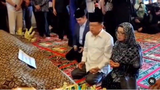 Setelahnya, JK duduk di depan jenazah dan memanjatkan doa untuk almarhumah. Selain Firli, tokoh lainnya yang hadir ialah mantan Dubes RI untuk Ukraina Yuddy Chrisnandi.