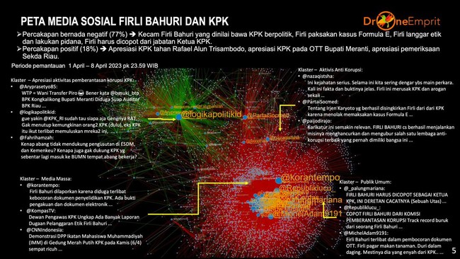 "Dalam percakapan tentang Firli dan KPK, tampak yang klaster yang paling besar adalah klaster merah (negatif) yang mayoritas berbicara tentang kontroversi Firli. Klaster hijau (positif) sangat kecil, terutama tentang OTT Bupati Meranti dan kasus Rafael," tuturnya.