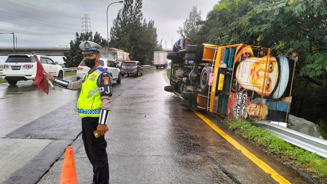 Informasi disampaikan akun Instagram TMC Polda Metro Jaya @TMCPoldaMetro, Senin (10/4/2023), truk terguling ketika hendak berbelok di Tol JORR.