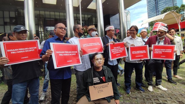 Para mantan pimpinan KPK itu membawa spanduk bertuliskan 'Masa Depan Pemberantasan Korupsi Lebih Penting Daripada Masa Depan Firli' 'Copot Pimpinan KPK Pelanggar Etik,' Dugaan Perkara Bocor Firli Harus Dicopot'. Mereka juga meneriakkan 'Copot Firli'