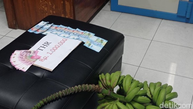 THR yang datang berisikan setandan pisang dan beberapa lembar uang mainan. THR itu dikirimkan sekelompok pelajar.