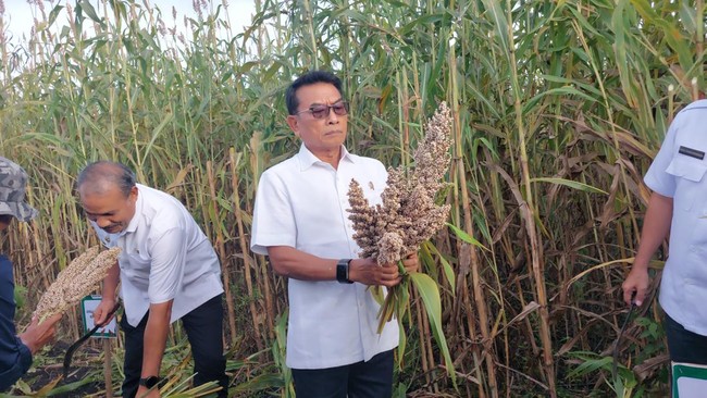 Moeldoko memanen sorgum di lahan 50 hektare milik PT Sumba Moelti Agriculture (SMA) di Desa Palakahembi, Waingapu, NTT. Dia mengatakan awalnya sorgum akan ditanam di lahan 400 hektare.