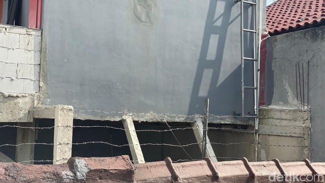 Terlihat dari arah rumah Pak Abdurachman, lahan uruk sudah didirikan bangunan di sekitarnya. Lokasi tembok yang mepet rumah Bu Ami ada di bagian paling pojok. Dari sini terlihat empat helai kawat berduri berjejer.