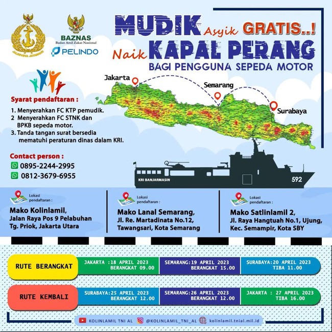 - Hubungi kontak center mudik gratis TNI AL 2023 melalui nomor: