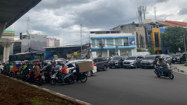 Kendaraan menumpuk di tengah simpang. Kondisi itu membuat lalu lintas macet. Kendaraan dari Jalan Kapten Tendean tak bisa melaju menuju arah Kebayoran Baru lantaran tertutup kendaraan lainnya.