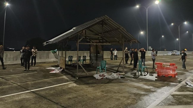 Pantauan detikcom di lokasi Jumat (14/4/2023) pukul 22.02 WIB, sudah tidak tampak massa aksi di lokasi. Namun terlihat sebuah bale yang didirikan di tengah jalan tol. Bangunan tersebut bertulisan 'bayar tanah kami'.