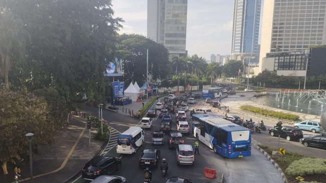 Pantauan detikcom, Senin (17/4/2023), pukul 07.50 WIB di Bundaran HI, Jakarta Pusat, arus lalu lintas dari Jalan Sudirman menuju Jalan MH Thamrin dan sebaliknya terpantau lancar.