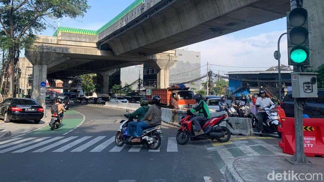 Penutupan persimpangan di sekitar Pasar Santa, Jakarta Selatan, menyebabkan macet parah. Pemotor kini nekat menerobos pelican crossing.