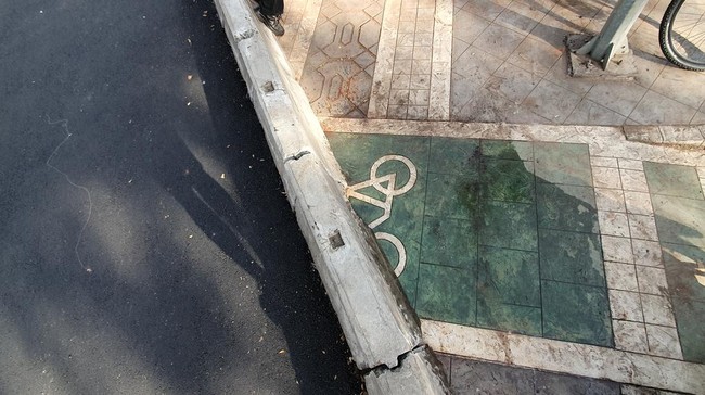 Pantauan di lokasi, Minggu (16/4/2023), barier beton dipasang memanjang di persimpangan hingga pos polisi. Adapun jalan raya yang baru diaspal terlihat menimpa trotoar dan jalur sepeda.