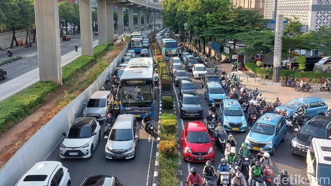 Hingga pukul 16.43 WIB, kemacetan masih terjadi di Jalan Rasuna Said arah Mampang. Beberapa pengendara motor bahkan nekat menerobos trotoar.
