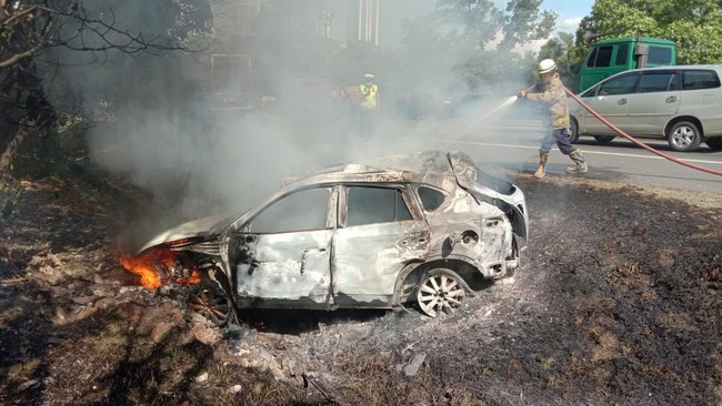 "Satu unit mobil Mazda CX5 yang kehilangan kendali dan terbalik ke parit kemudian terbakar dikarenakan mobil tersebut membawa tiner," kata Ujat.