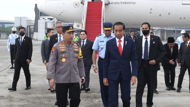 Di bawah tangga pesawat, Jokowi dan Iriana tampak disambut oleh Kapolri Jenderal Listyo Sigit Prabowo, Kepala Staf Angkatan Udara (KSAU) Marsekal TNI Fadjar Prasetyo, dan Pj Gubernur Banten Al Muktabar.