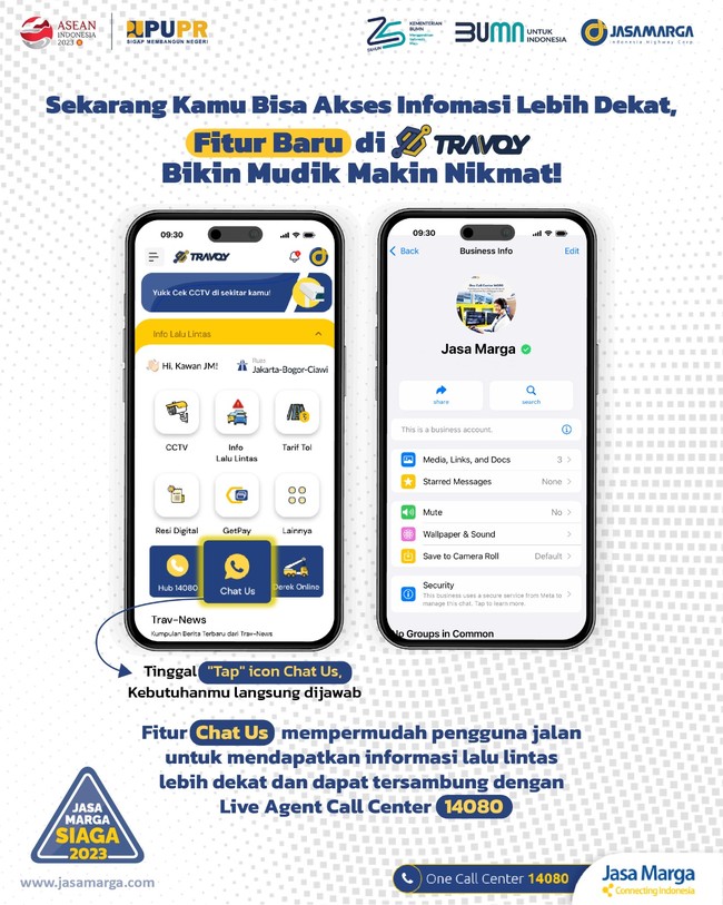 Fitur baru lainnya, sambung Lisye, yaitu Chat Us. Dengan fitur ini, pengguna jalan akan diarahkan ke layanan pesan WhatsApp berbasis Artificial Intelligence (AI) yang terintegrasi dengan Jasa Marga Integrated Digitalmap (JID).