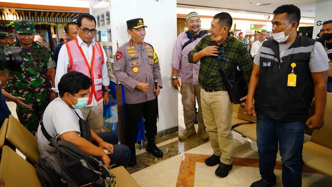 Kapolri Jenderal Listyo Sigit Prabowo mengecek arus mudik Lebaran 2023 di Bandara Juanda, Sidorajo, Jawa Timur (Jatim). Saat bertemu dengan pemudik, dia menjelaskan keberadaan posko terpadu yang siaga untuk membantu pemudik.