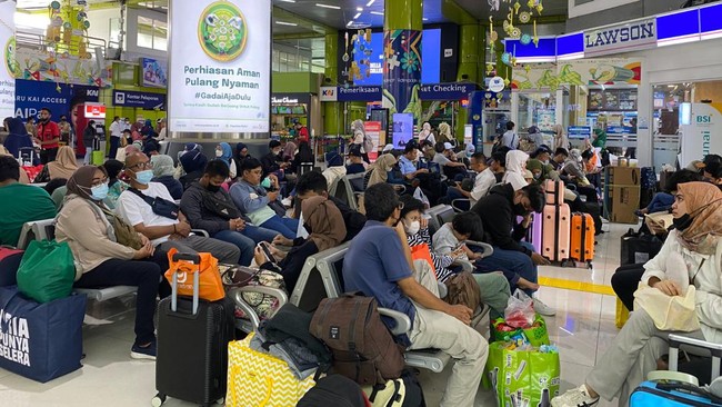 Pantauan detikcom di Stasiun Gambir, Jakarta Pusat, Rabu (19/4/2023), terlihat Stasiun sudah padat para pemudik. Tampak pemudik sedang menunggu keberangkatan.