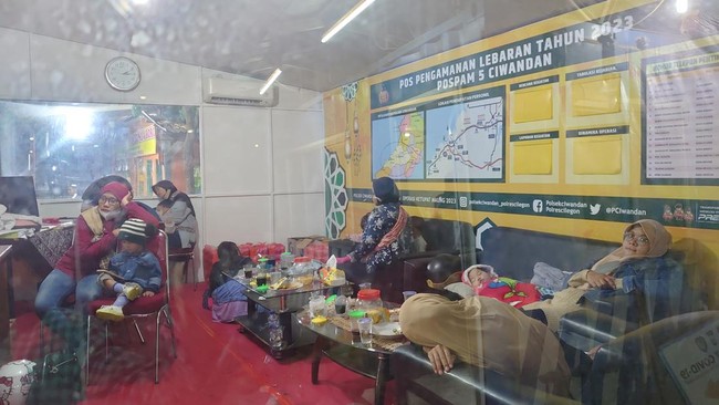 Puluhan ibu-ibu yang membawa anaknya dievakuasi oleh polisi bermotor dan ambulans Dinkes Cilegon. Polisi dan ambulans mondar-mandir mengevakuasi pemudik agar dapat beristirahat di pos polisi yang berada di simpang Jalan Lingkar Selatan (JLS) Cilegon.