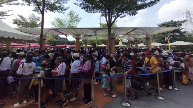 Terlihat antrean yang mengular di depan pintu masuk wahana Dufan. Di hari yang cerah ini, beberapa orang juga berfoto bersama di depan tulisan 'Dufan' dan menikmati suasana di kawasan tersebut.