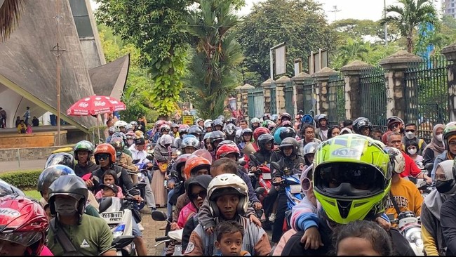 Pengunjung didominasi oleh kendaraan roda dua. Antrean panjang pengendara roda dua itu sudah terjadi dari luar pintu masuk Ragunan.