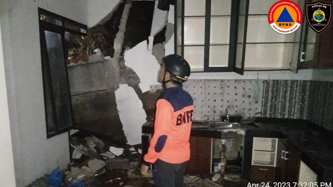 "Longsoran tinggi tebing 10 meter lebar 12 meter, longsor menimpa 2 rumah yang mengakibatkan rusak berat. Penyebab (longsor) hujan lebat," ujar Gumay dalam keterangannya, Senin (24/4/2023).