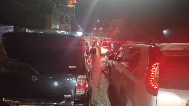 Tampak kendaraan pelat nomor B terparkir di pinggir jalan bahkan hingga memakan setengah badan jalan. Ekor kemacetan mencapai 10 Km.