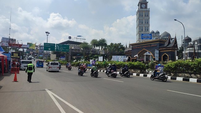 Pantauan detikcom di Simpang Gadog, Rabu (26/4/2023), kendaraan didominasi sepeda motor dan mobil pribadi. Lalu lintas terlihat lengang, baik dari jalur arteri maupun tol.