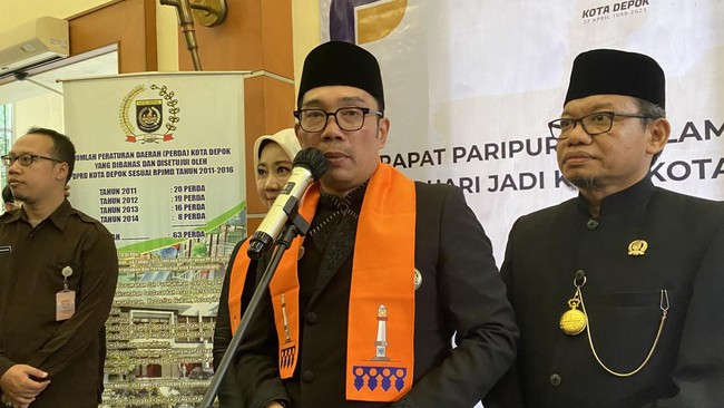 Gubernur Jawa Barat (Jabar) Ridwan Kamil (RK) hadir dalam rapat paripurna DPRD memperingati hari jadi Kota Depok ke-24. RK memberikan pesan kepada warga Depok.