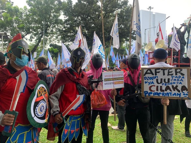 Partai Buruh dan sejumlah organisasi serikat buruh menggelar aksi memperingati Hari Buruh Internasional atau May Day di kawasan Patung Kuda, Jakarta Pusat. Aksi itu diramaikan dengan massa buruh yang mengenakan kostum 'Squid Game' hingga kostum ala prajurit Sparta.